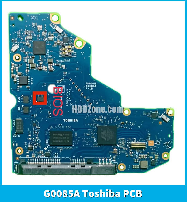 en el Toshiba G0085A placa lógica disco duro, el chip BIOS generalmente se encuentra cerca del chip de control principal. Aparece como una pequeña ficha cuadrada negra con un paquete de 8 pines. Tenga en cuenta que, con los avances en la tecnología de discos duros, algunos discos duros pueden tener varios chips BIOS (2-6), todos los cuales deben reemplazarse durante la transferencia de firmware. Y algunas de las placas de circuito impreso tienen chips BIOS integrados dentro del chip principal (el chip más grande de la placa), generalmente con muchos pines, y se requiere una cierta cantidad de tecnología para reemplazarlos.