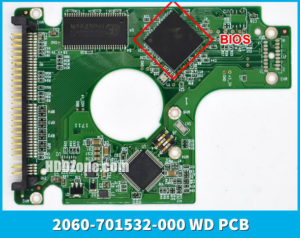 en el WD 2060-701532-000 placa lógica disco duro, el chip BIOS generalmente se encuentra cerca del chip de control principal. Aparece como una pequeña ficha cuadrada negra con un paquete de 8 pines. Tenga en cuenta que, con los avances en la tecnología de discos duros, algunos discos duros pueden tener varios chips BIOS (2-6), todos los cuales deben reemplazarse durante la transferencia de firmware. Y algunas de las placas de circuito impreso tienen chips BIOS integrados dentro del chip principal (el chip más grande de la placa), generalmente con muchos pines, y se requiere una cierta cantidad de tecnología para reemplazarlos.